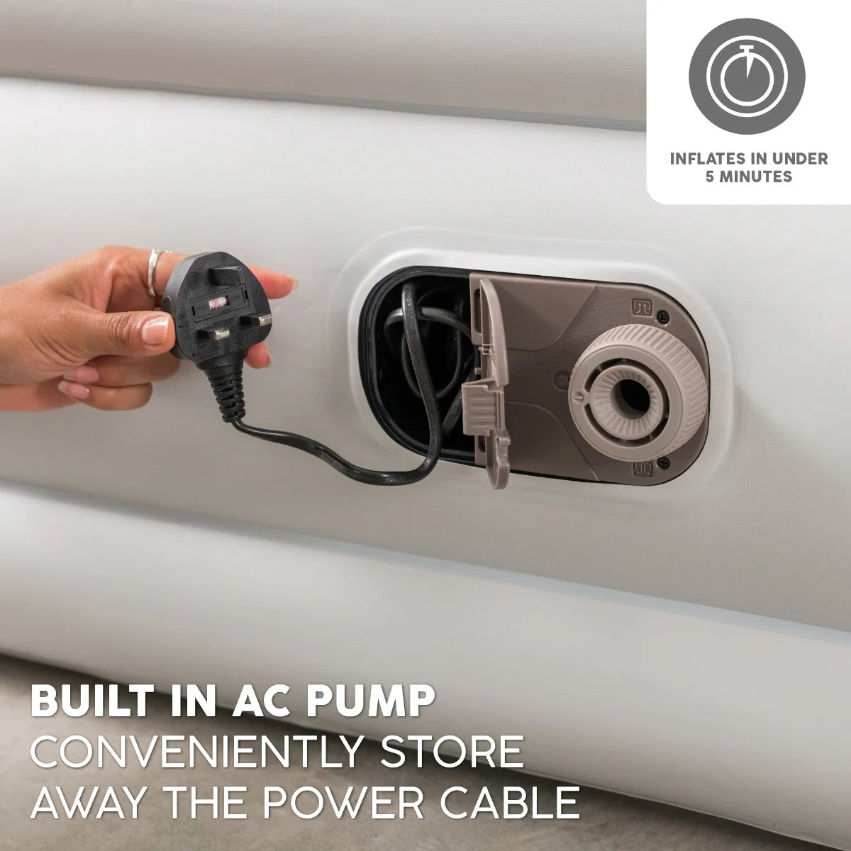 The Bestway Single TriTech™ Airbed inflates in under 3-4 minutes using the built-in AC pump, allowing you to enjoy a comfortable sleeping setup in no time. Once inflated, the power cable can be neatly stored in the integrated compartment, keeping everything tidy and organised. For added flexibility, the airbed can also be inflated using a manual pump or a portable electric pump with a car adaptor (sold separately).