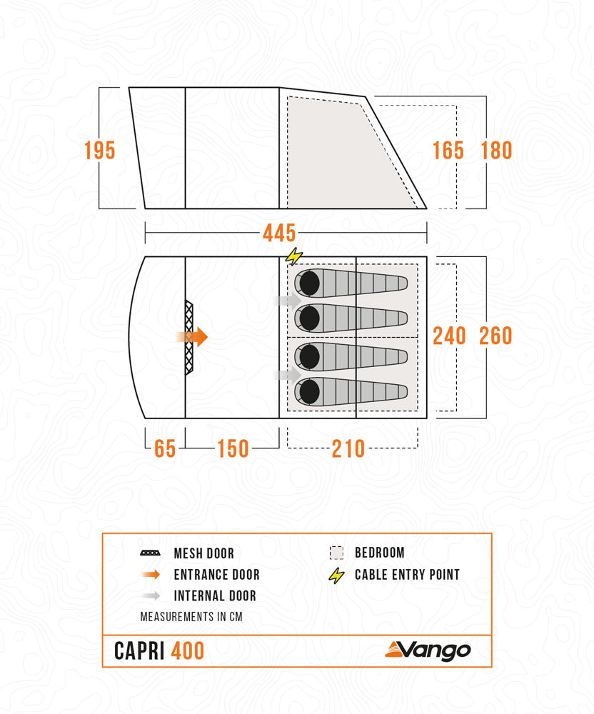 The Vango Capri 400 is a practical and welcoming 4-man poled tent, ideal for weekend camping trips with family or friends. Built with durable Powerflex® fibreglass poles, it offers excellent stability alongside a bright, spacious living area and an integrated front canopy for extra shelter. Generous bedroom space, full standing height and an open lounge create a comfortable balance of space and light. Made from Sentinel Essential fabric with a 3,000mm hydrostatic head, the Capri delivers reliable waterproof protection. Queen-size Lights-Out® bedrooms reduce early morning light for improved sleep, making this an excellent choice for campers new to outdoor adventures.