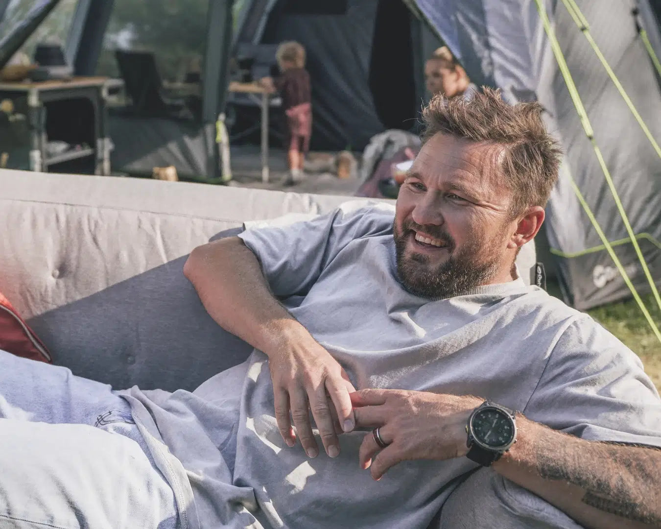 Yes, the sofa works well inside tents, awnings, or outdoor leisure spaces thanks to its durable, easy-clean base.